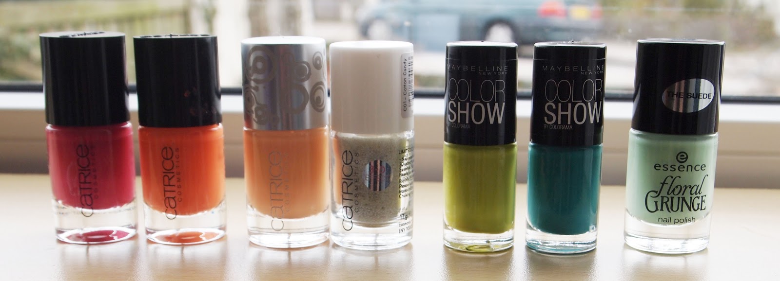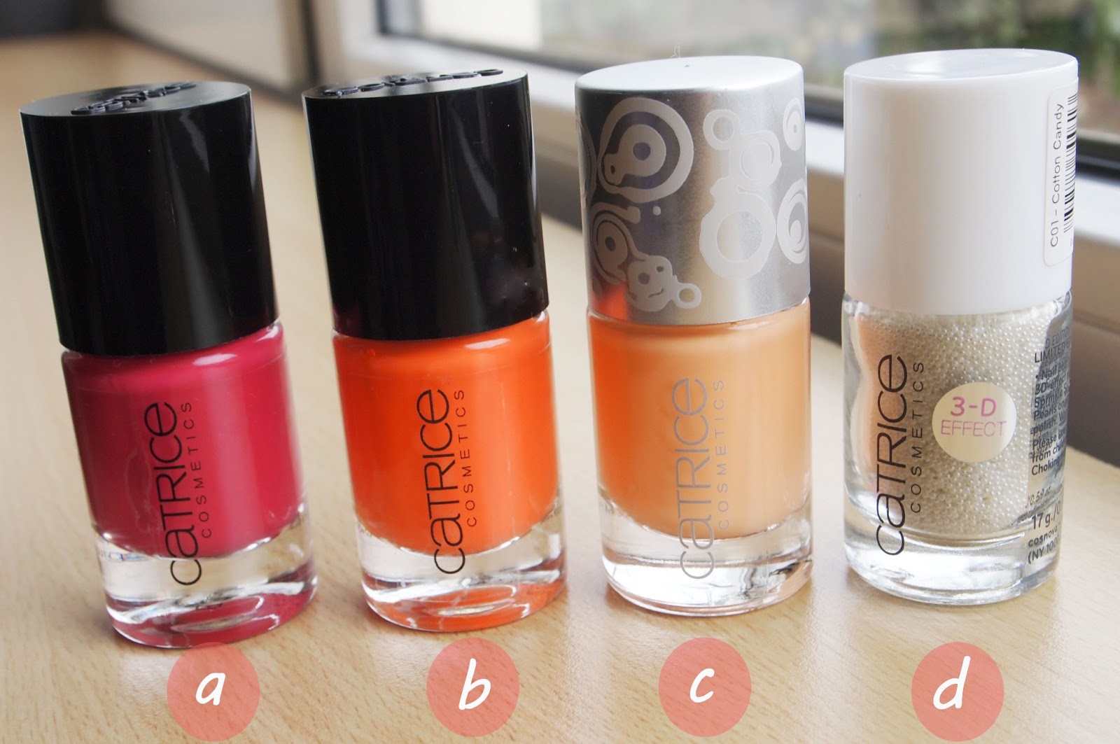 a. Catrice Ultimate Nail Lacquer 01 Fuschsiarama b. Papa don't Peach c. Catrice Soft Nail Lacquer limited edition Candy Shock d. Catrice 3-D effect Nail Sugar Pearls