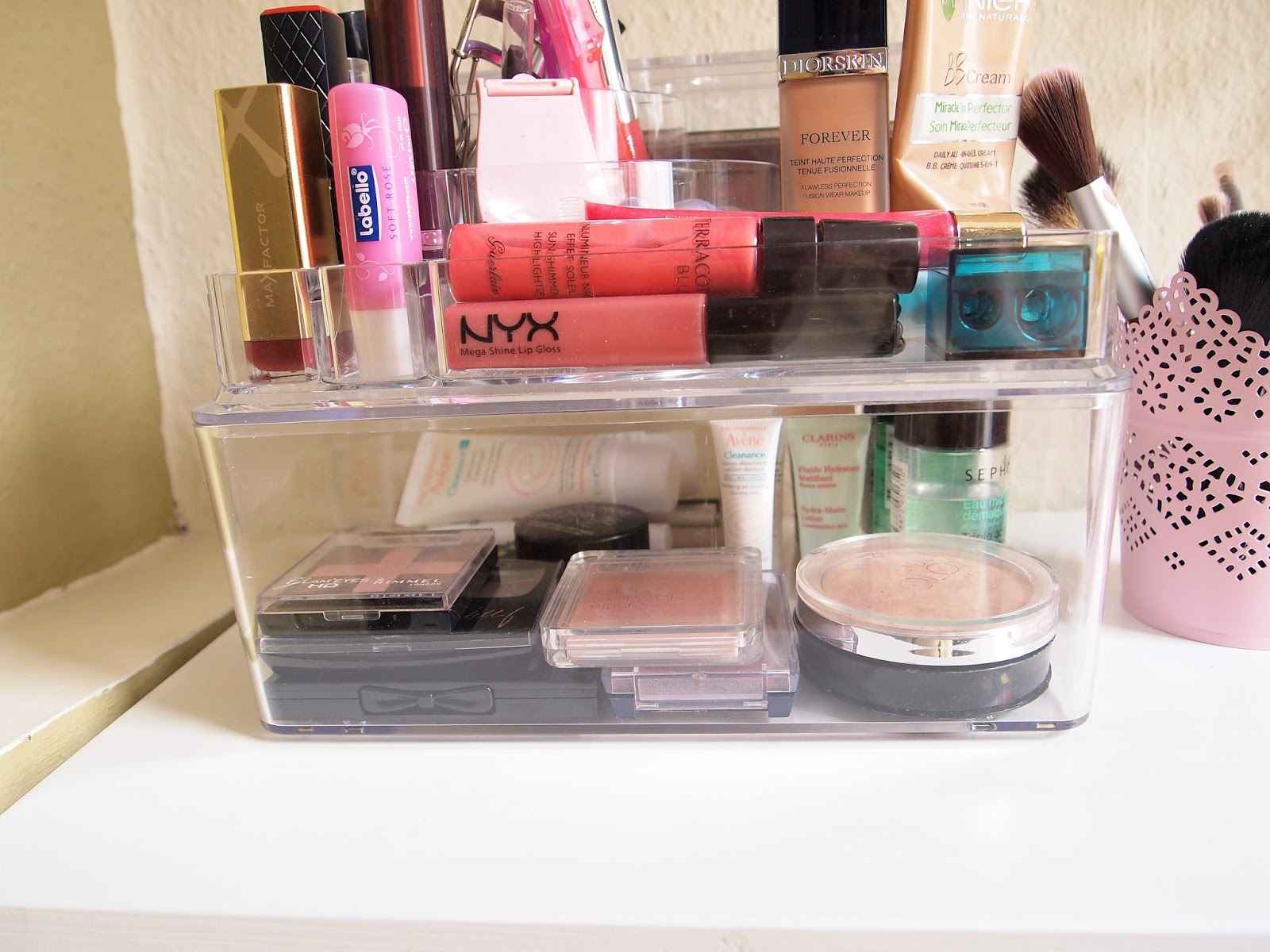 Below is where I put my skincare products and other eyeshadow palettes and old make up products that I own.