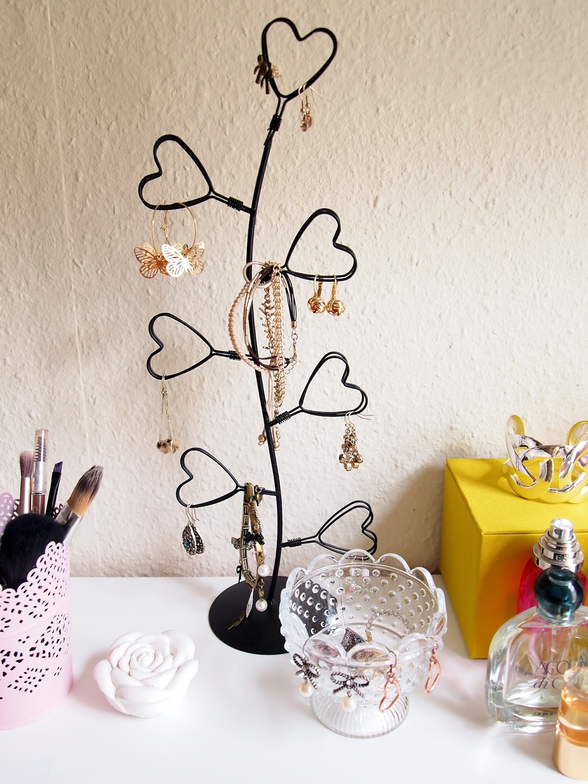I collect magazines too like Glamour NL so to inject some fashion inspiration I incorporated a shopaholic book, my bag and sunglasses to the design. I find it really chic and pretty. I have perfume collection so I thought it would be nice to include them also. I store some of my accessories into the two yellow green boxes.