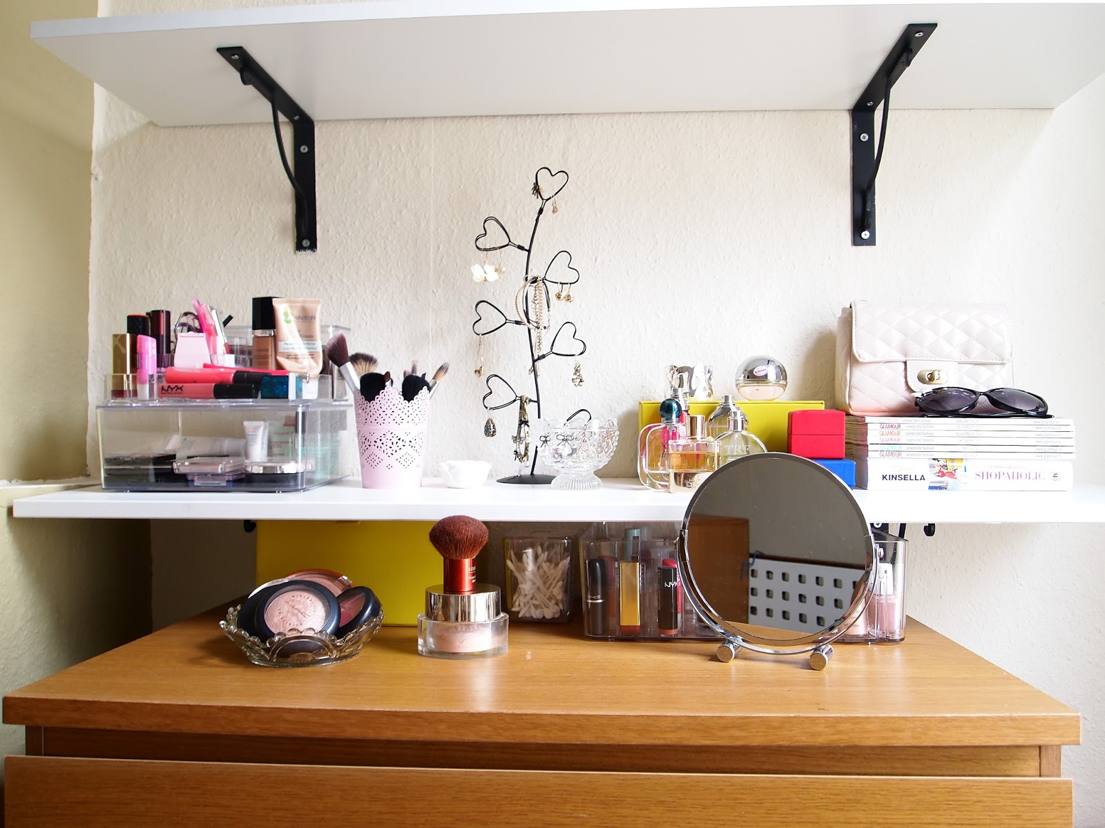 We have two wall shelves that I didn't know how to design and make use of it and just placed some books and it was really bland and unispiring. And I placed my make up products inside a drawer in our bathroom before. When I saw blogger stations I realized is really a great idea to have one and apply make up where I can sit and have a proper day light because I used to apply make up in our bathroom and I needed to go in and out because I needed natural light to apply foundation and blush because I can't see it good in our bathroom.
